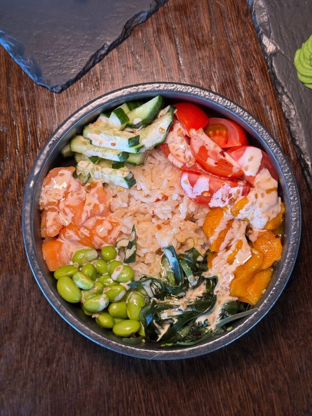 Рис, огурец, лосось , бобы эдамаме, чука, манго, черри, ореховый соус , соус понзу